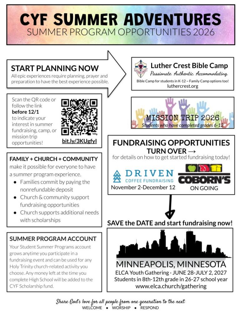 CYF registration for the 2025-26 program year is NOW OPEN for all students, birth – grade 12. Programs available on Sunday mornings or Wednesday evenings. One registration per child/student, please.