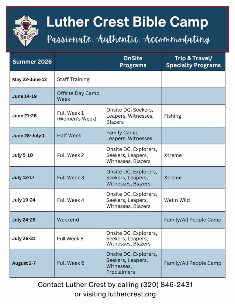 - Weekly Participation: Students participate in worship, followed by large & small group discussions where they dive into what it means to be a Lutheran and a Christian in today’s world.